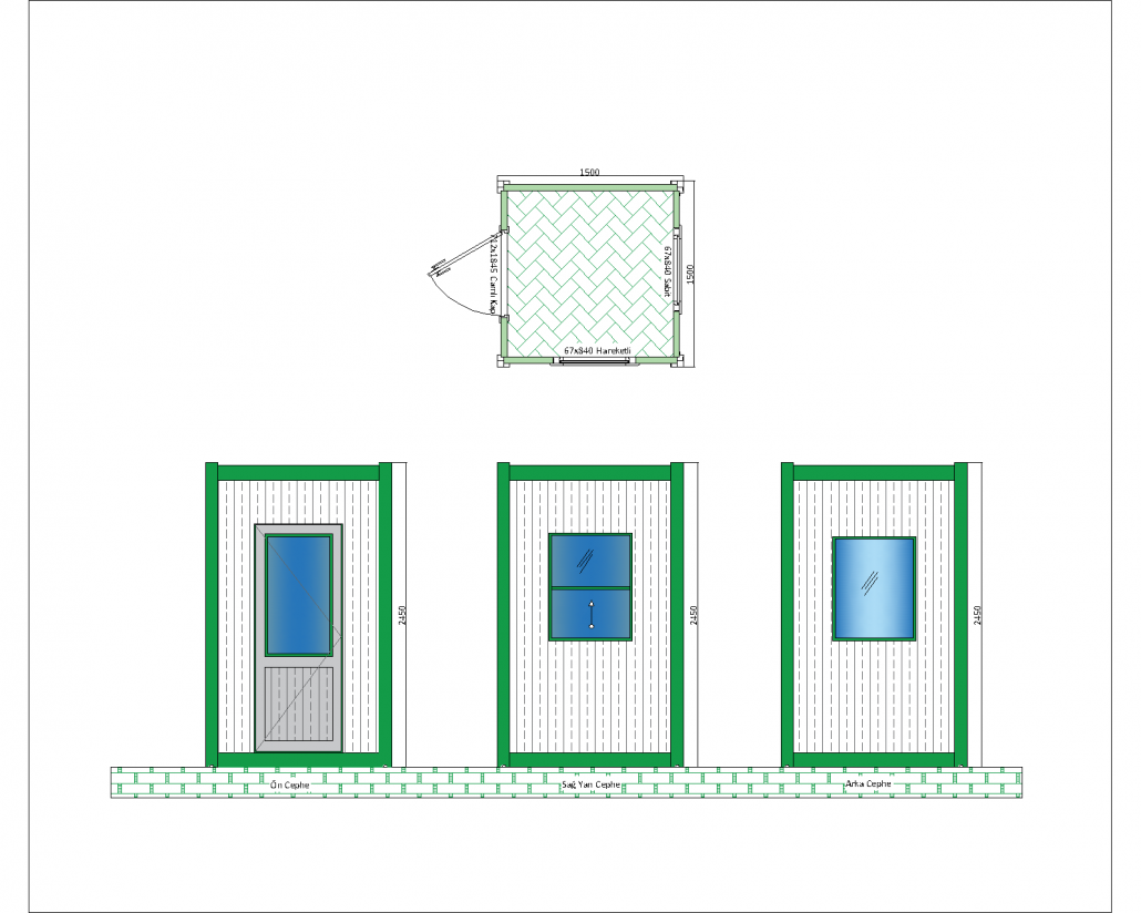 This panel cabin is a model that stands out with its compact structure and functionality. With its 1500 mm x 1500 mm base dimensions and 2540 mm height, it is ideal for use in limited areas. It is designed to provide a temporary solution in places such as construction sites, security points or small office areas.