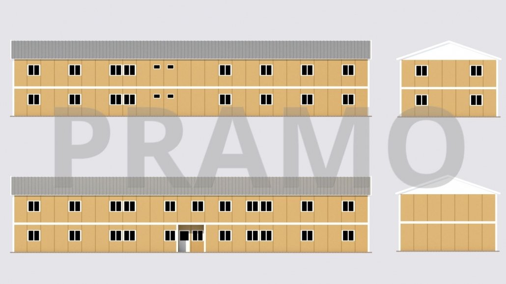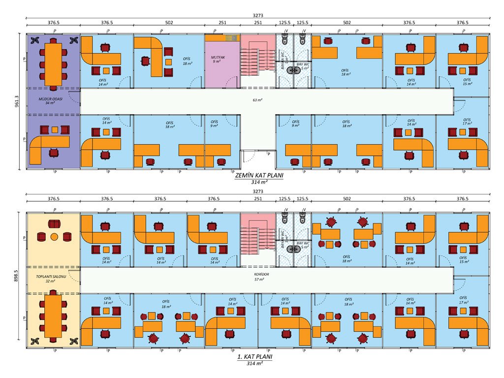 A 32 m² meeting room on the first floor provides an ideal environment for business meetings and teamwork. Office areas of different sizes on both floors offer comfortable and functional work areas. This office building, which can be quickly installed thanks to its modular structure, is ideal for construction sites, temporary offices or permanent workplaces with its portable and flexible structure.