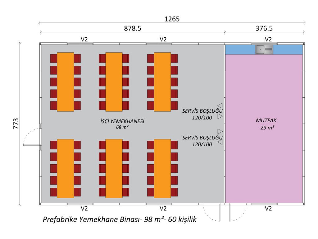 This prefabricated dining hall building offers a practical solution with its 98 m² usable area and 60-person capacity. The 68 m² wide workers’ dining hall area provides a comfortable dining environment with dining tables and seating arrangement. The area used in the dining hall section is designed with the comfort of the workers in mind with a spacious and orderly layout. The service spaces are 120/100 cm wide, providing comfort during meal service.